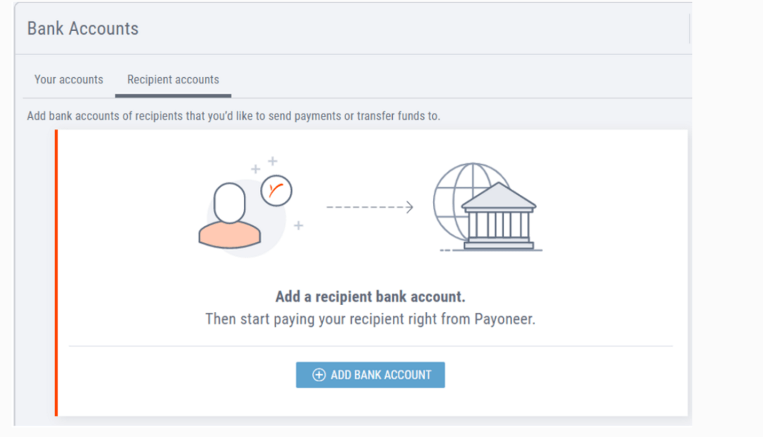 接着您需要添加收款人银行账户。如果这是您第一次通过Payoneer向该收款人付款,请点击屏幕顶部的设置,在下拉菜单中选择银行账户。在银行账户页面中,选择收款人账户并添加银行信息。