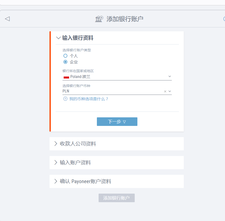 点击下一步,并按要求填写账户详情。请准确填写波兰增值税官方部门提供的银行信息。请注意,输入IBAN编号时不得包含空格。会计提供的memo需要填写英文,去除字符。