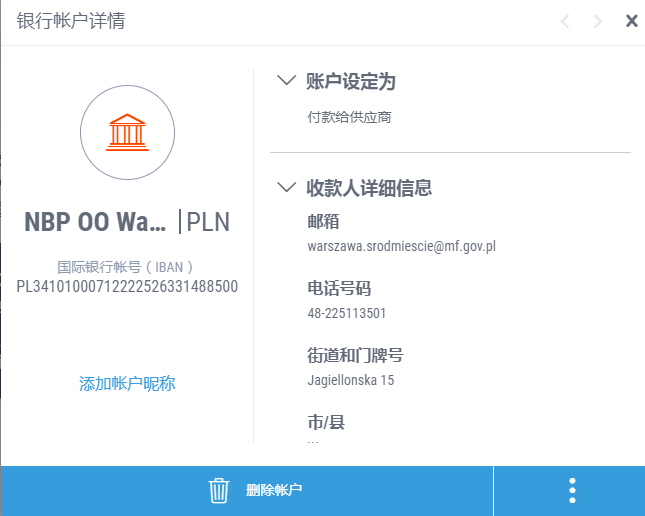 成功添加账户后,您就可以在收款人账户中看到波兰增值税银行账户。然后,请按照以下说明支付增值税: